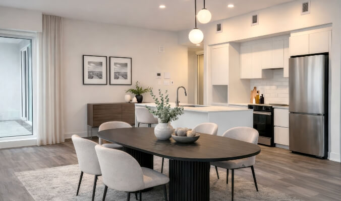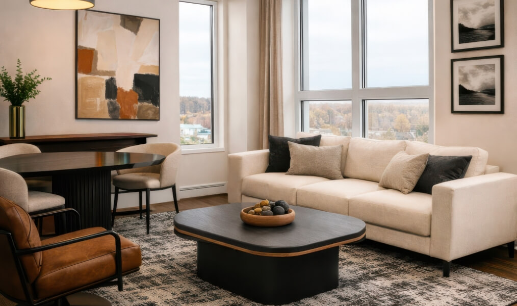 Des fenêtres pleine hauteur, des plans réfléchis et une touche de modernité définissent les appartements AXIA, offerts en configurations de 2 et 3 chambres, conçus pour assurer confort et harmonie au quotidien. Des électroménagers modernes, une salle de bain complète avec bain et douche ainsi qu’une salle de lavage intégrée à l’unité ajoutent simplicité et fonctionnalité à la vie de tous les jours.